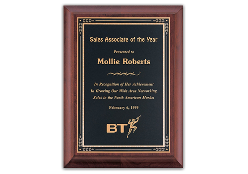 The Cherry Finish Plaque with Gold Florentine Plate is a token of recognition designed in excellence. The simple yet intriguing design of the engraving plate is beautifully etched in several designs to frame your accomplishment. Available in different sizes and designs, this award plaque is the recognition award you have been looking for! Custom laser engraving is included at no additional cost!